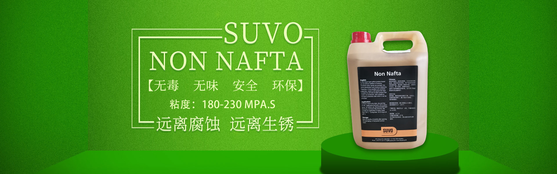 SUVO Non Nafta 是一款無毒、無味、安全、環(huán)保的油基/蠟基防銹產(chǎn)品,不含溶劑,內(nèi)含超強的防腐劑。 涂刷本產(chǎn)品后,會在被保護(hù)的工件表面形成一層80-100微米厚的油脂、蠟基保護(hù)膜,保護(hù)金屬產(chǎn)品免受惡劣環(huán)境侵害,遠(yuǎn)離腐蝕,遠(yuǎn)離生銹。 產(chǎn)品適合于鋼鐵制品在陸地存儲或海上運輸過程中的長期防腐,防銹。本產(chǎn)品非常易于被石油精/煤油清洗劑清除,清洗過程不損傷工件表面,不污染施工環(huán)境。